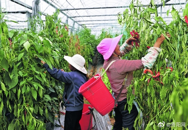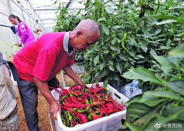 “丰收喽!”随着一声嘹亮的吆喝,村民将一筐筐刚从大棚里采摘的辣椒抬上小货车。经过分拣、配送,第二天一大早,这些辣椒便将出现在贵阳以及粤港澳大湾区居民的餐桌上。