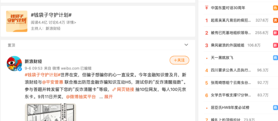 从渠道布局来看,陆金所控股此次实现了多渠道立体传播,为国家"反诈反骗"宣传行动助力。截至目前,仅在微博话题,阅读量已达到4.4亿,讨论跟帖超过6万,同时包括各地官博的信息发布、网警官博积极跟进响应等宣传动作,"钱袋子守护计划"已成为"金融知识普及月"的流量焦点之一。