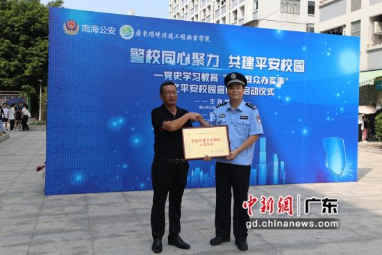启动仪式现场,在丹灶派出所警辅人员、环保学院师生代表、镇综治办、南海移动公司丹灶支局、丹灶启明星驿站相关代表见证下,丹灶派出所副所长郭念广将“警校共建平安校园示范单位”牌匾递交于广东环境保护工程职业学院副校长奚创旭手上。