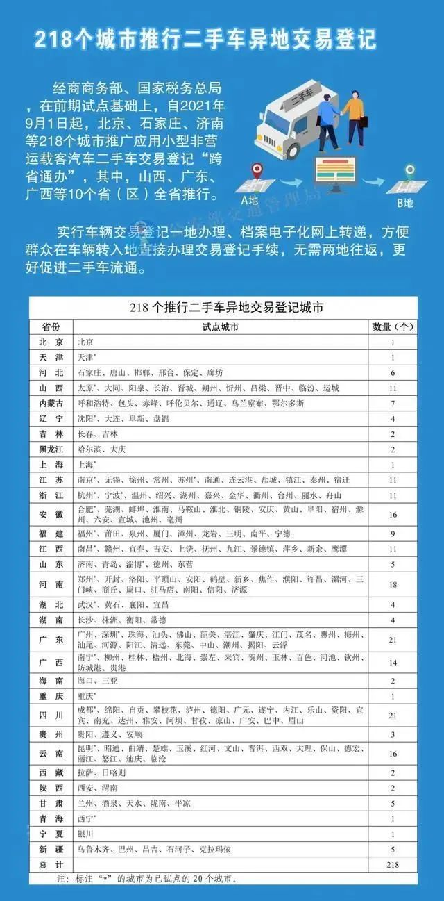 9月1日起,公安部将在全国218个城市推行二手车异地交易登记“跨省通办”。经商务部、国家税务总局,在天津、太原、沈阳、上海等20个城市试点推行小型非营运载客汽车二手车交易登记“跨省通办”基础上,北京、石家庄、济南等218个城市推广应用其中,山西、广东、广西等10个省(区)全省推行。对二手车需要在异地交易的,实行二手车交易登记一地办理、档案电子化网上转递,实现二手车全国范围内跨省跨市异地交易登记,无需两地往返,更好促进二手车流通。