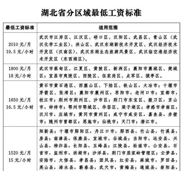 根据国家《最低工资规定》有关要求和人社部批复意见,调整过后,湖北省全日制就业劳动者月最低工资标准按区域(如图)划分为四档,依次为2010元、1800元、1650元、1520元,非全日制就业劳动者的小时最低工资标准依次为19.5元、18元、16.5元、15元。