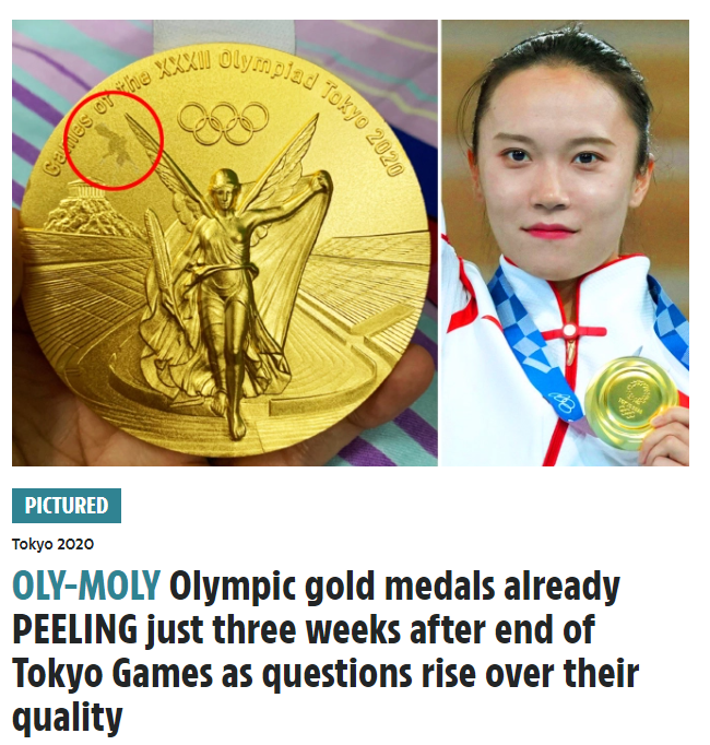 北京时间8月28日,英国媒体《太阳报》,也关注了奥运会金牌掉皮的问题。